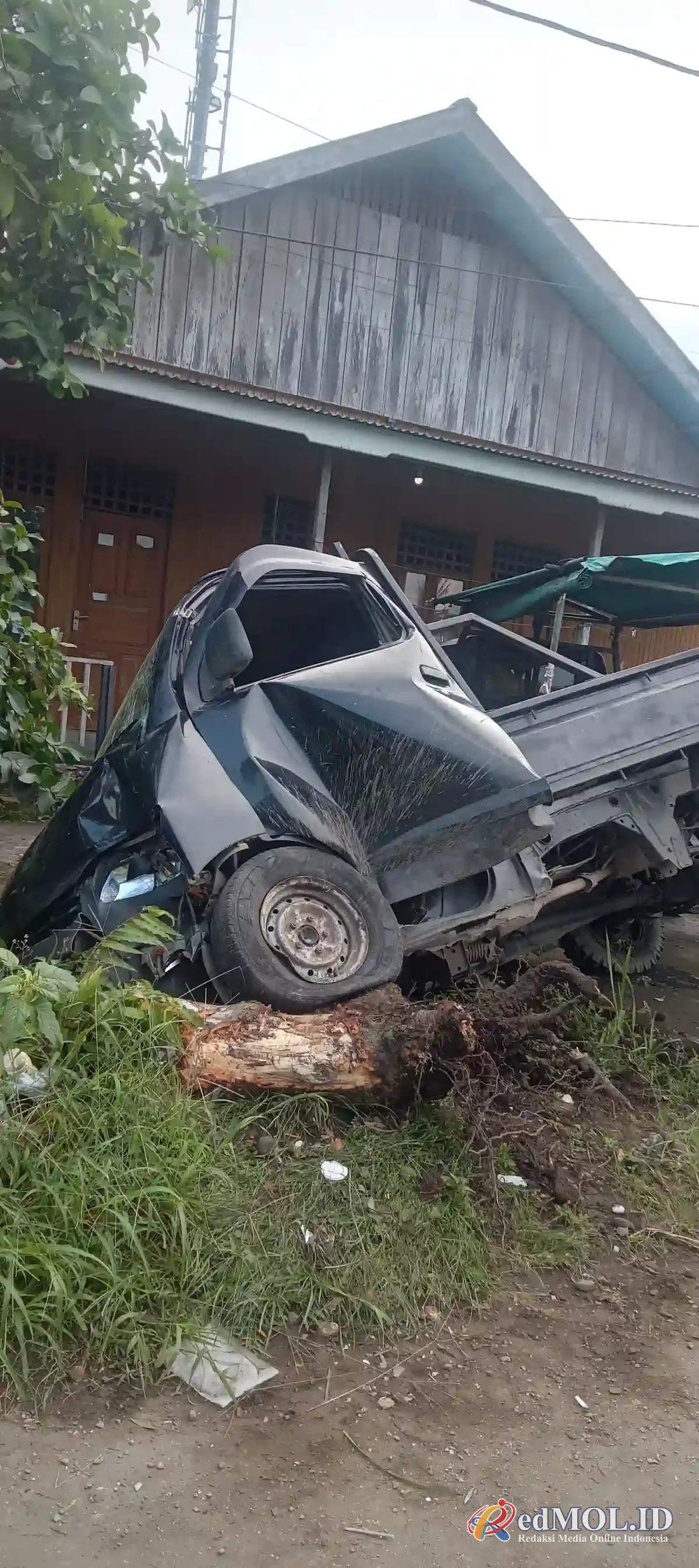 Berdasarkan pantauan di lokasi kejadian, mobil pikap berwarna gelap terlihat ringsek di bagian depan dan samping, kaca kendaraan pecah, serta bodi tertekuk akibat benturan keras. Kendaraan keluar dari badan jalan hingga masuk ke pekarangan rumah warga dan menabrak batang kayu besar sebelum akhirnya berhenti.
