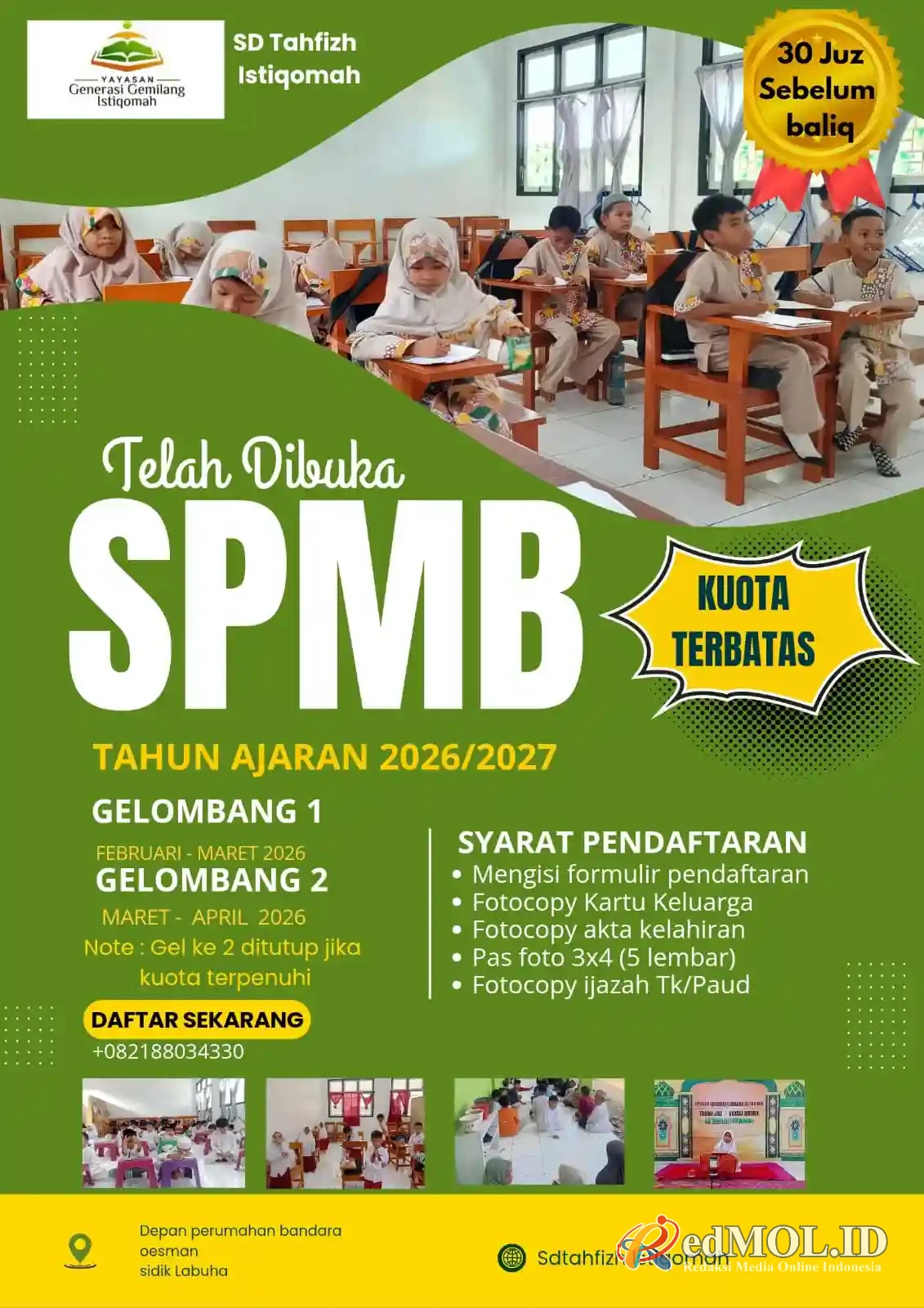 Labuha, redmol.id — SD Tahfizh Istiqomah di bawah naungan Yayasan Generasi Gemilang Istiqomah resmi membuka Seleksi Penerimaan Murid Baru (SPMB) Tahun Ajaran 2026/2027. Pendaftaran dibuka dalam dua gelombang dengan kuota peserta yang terbatas.